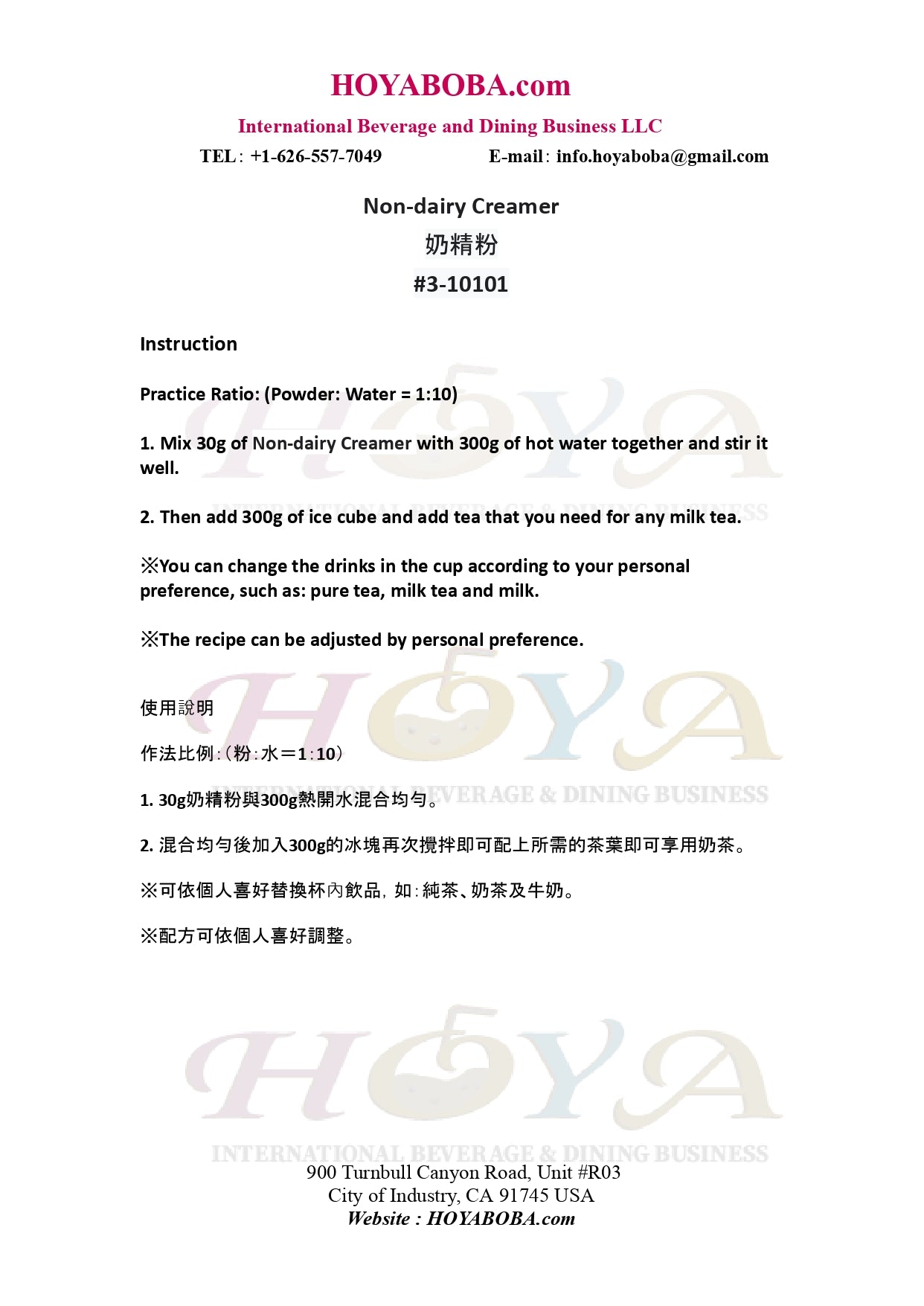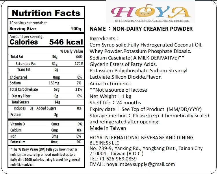 Hoya Non-Dairy Creamer is the non-GMO, zero trans-fat, and phosphous-free, high-quality product s imported from Korea. Due to its high-fat content, the product offers a creamy, sweet, rich, and aromatic flavor suitable for preparing milk tea. This is a new improved premium powder can be used as a base for milk teas and drinks. Hoya premium powders are securely sealed maintain the quality of the powder. To ensure uncompromised and senitary usage, powders should be store in a vacumn sealed powder container and always use a dry, clean powder scoop.